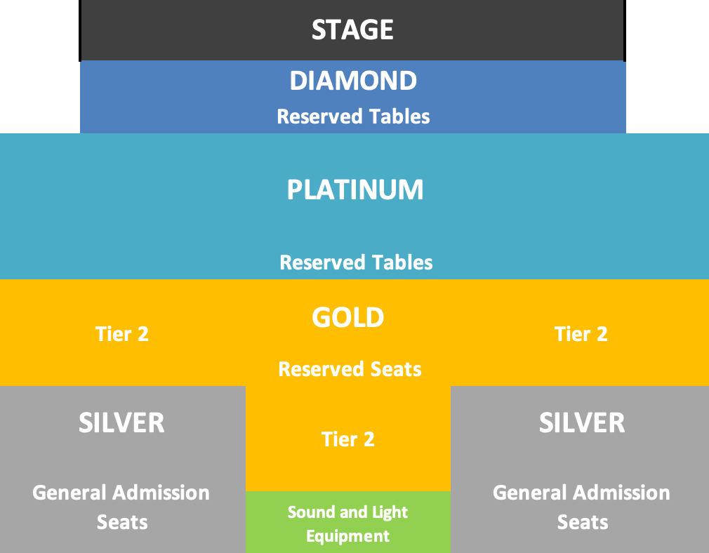 PLATINUMReserved Seating in the 2nd section from the stage. Cabaret style with tables and all-inclusive drink service.